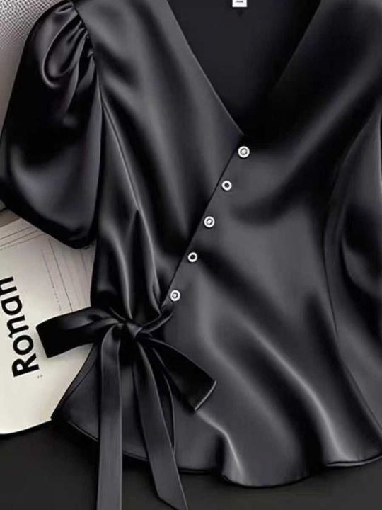 高级感气质独特醋酸缎面V领黑色衬衣,[爱心]65件左右,款号#7210,码数M-XL,穿80-130斤,万佳档口货,原包装️无瑕疵,[666]实体店品质