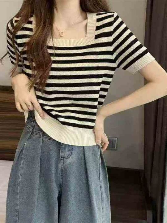 夏季新款撞色条纹修身显瘦针织短袖T桖,独立包装,均码面料柔软舒适弹力大...