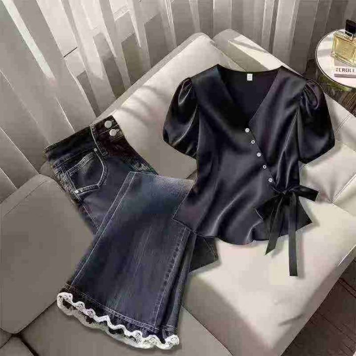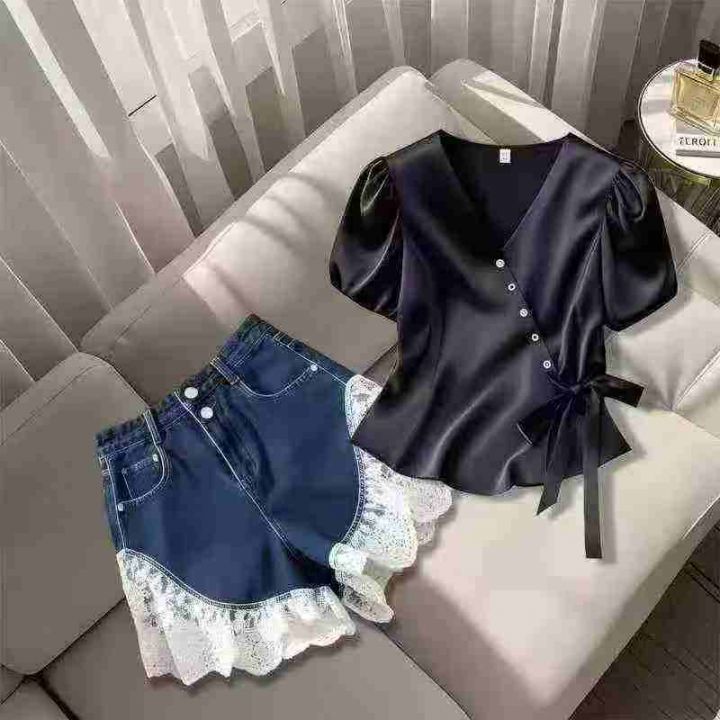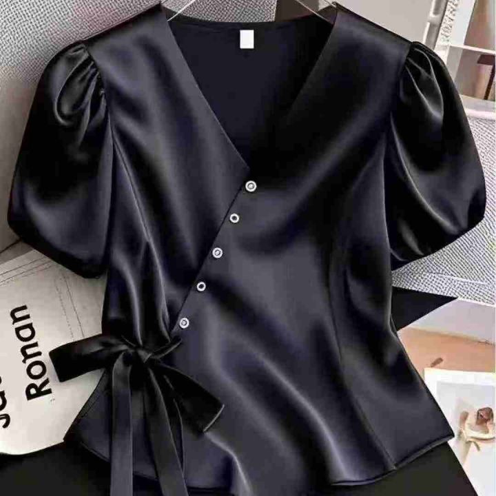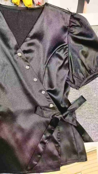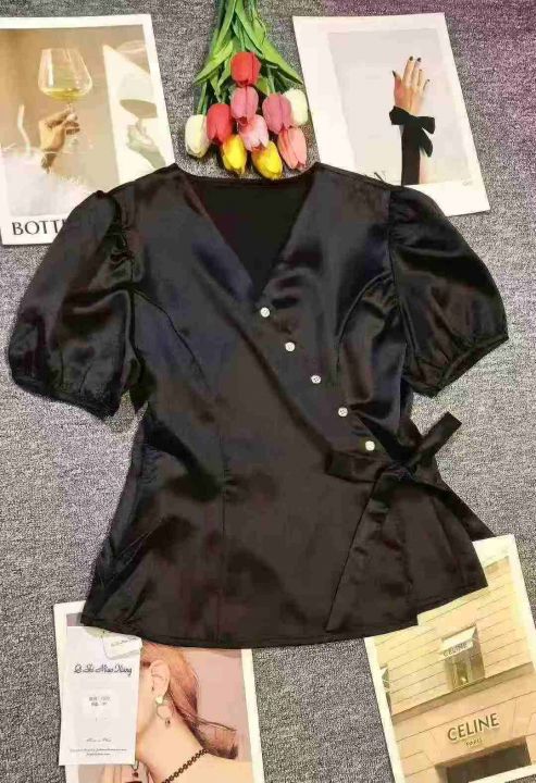 高级感气质独特醋酸缎面V领黑色衬衣,[爱心]65件左右,款号#7210,码数M-XL,穿80-130斤,万佳档口货,原包装️无瑕疵,[666]实体店品质