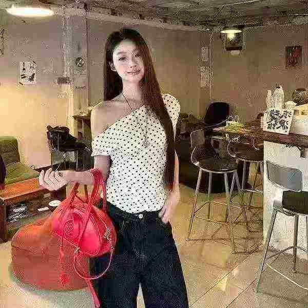 复古甜美波点斜肩修身辣妹上衣,[爱心]95件左右,蓝色为主,款号#1034,均码,穿70-120斤,万佳档口货,原包装️无瑕疵,[666]实体店品质