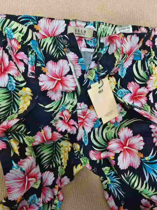 外贸原单印花裤子约2000条,五个花型,美国码S~XL,原品牌独立包装和吊牌三标齐全。做工精致。面料有三款97%棉,两款97%涤纶,都有弹性。