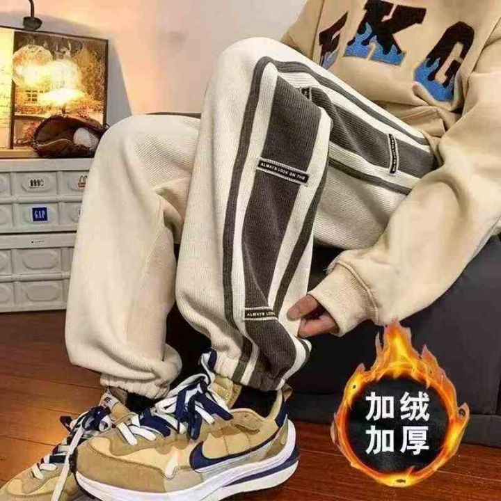 侧边条纹灯芯绒男冬季加绒加厚潮牌宽松束脚裤子,整款...