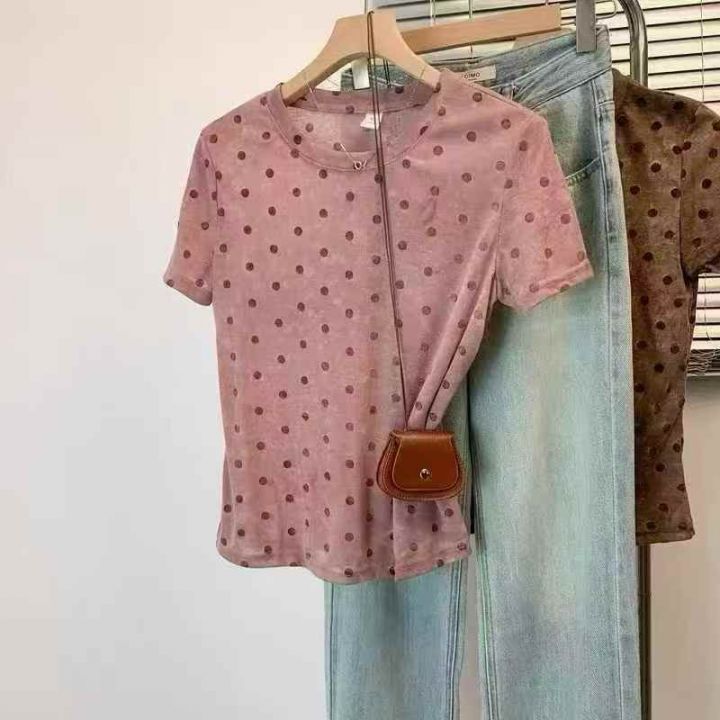 重工晕染波点圆领短袖T恤女夏季设计感显瘦遮肉气质上衣,整款2色,紫色为主...