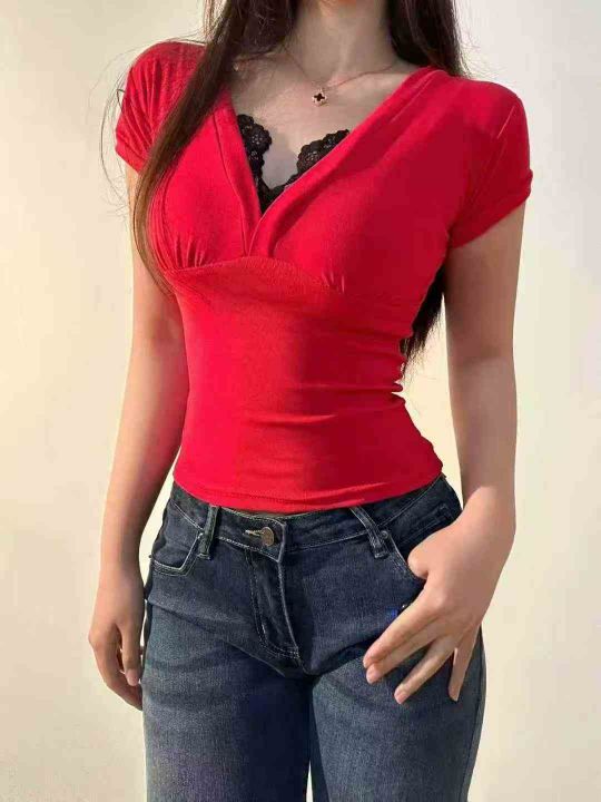 显瘦性感纯欲V领蕾丝短袖T恤女夏昆士兰平纹辣妹正肩上...