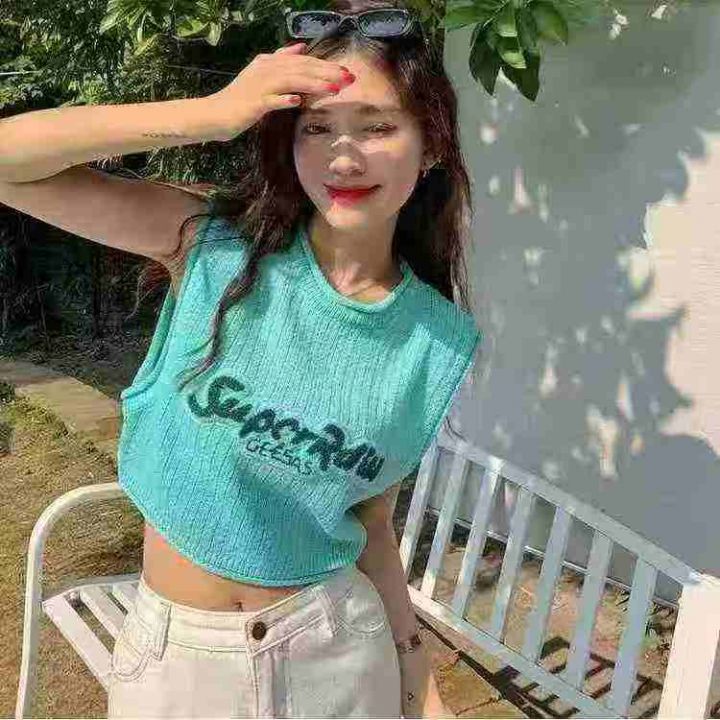 清货3.9元纯欲甜辣短款字母刺绣针织背心女夏季外穿宽...