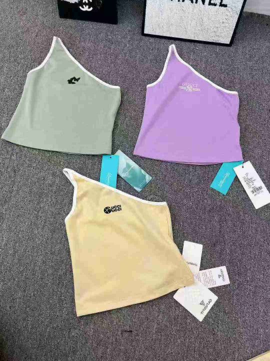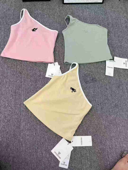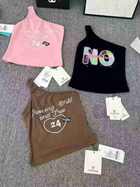 230件品牌甜辣风斜肩背心,小整款,多款多色图案多,均码,面料螺纹棉跟纯棉。(模特图仅供参考上身效果)
