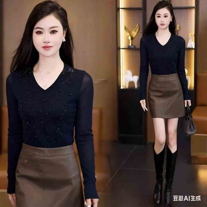 全清6.9元韩版V领钉珠烫钻长袖T恤女款 1913件 1-7码 分货➕1 大货黑色少...