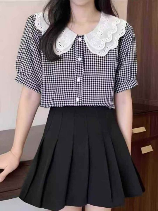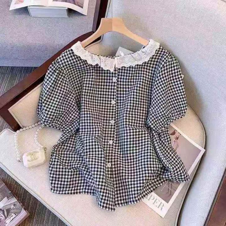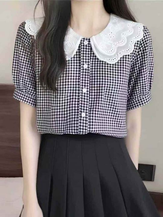 ☕️娃娃领短袖衬衫女夏季花边蕾丝格子衬衣宽松显瘦法...