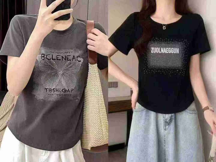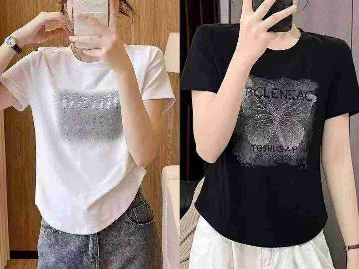 靓妹正肩短袖t恤女2025夏季新款爆款深圳高端欧货潮牌短款修身弹力小上衣,烫钻在阳光下闪闪发光,走路都带,正肩设计完美修饰肩型[哇],后领包边到肩不易变形[强],高弹力修身t穿上就是漫画身材[色],颜色图案多爆款闭眼入[好的],独立包装带吊牌。这性价比直接拉满✅,100/200起分货混配➕1