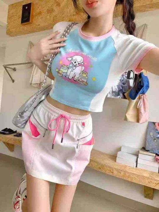 ☕️纯棉辣妹T多巴胺撞色插肩袖减龄卡通印花短款短袖...