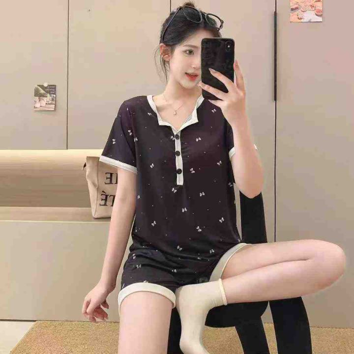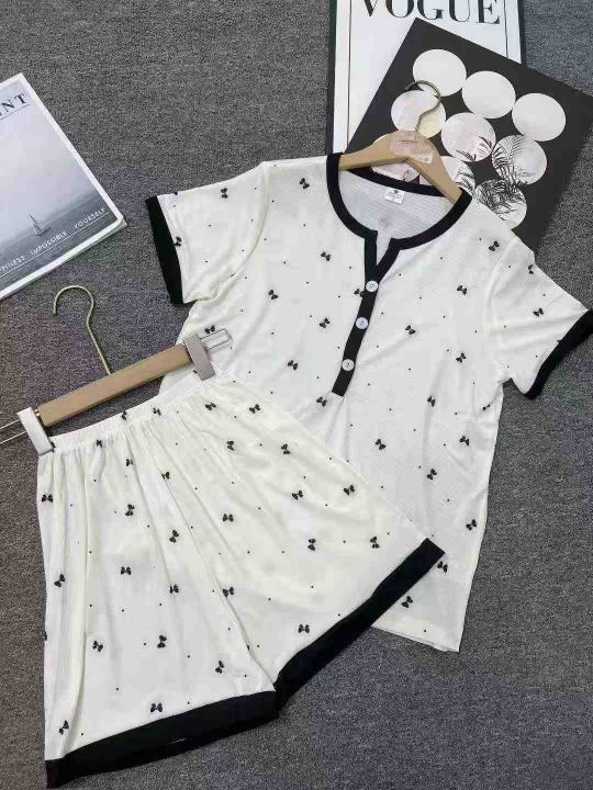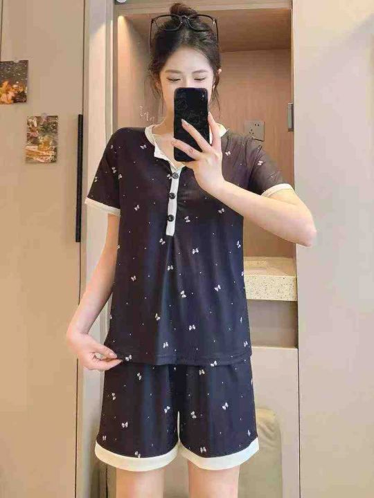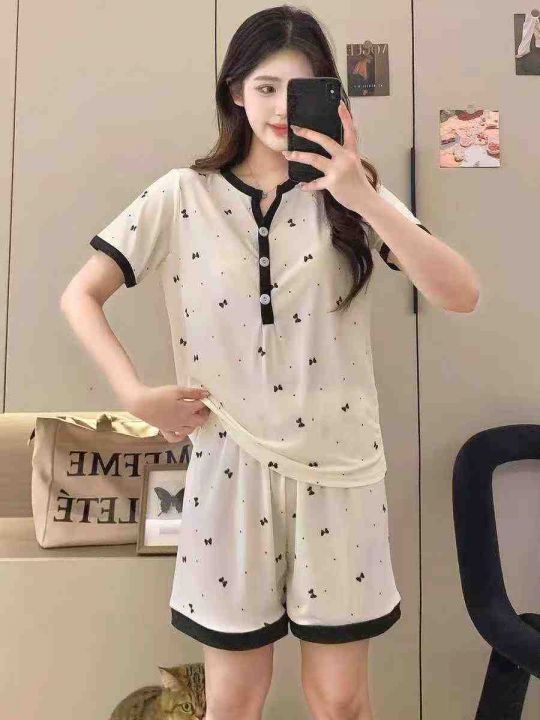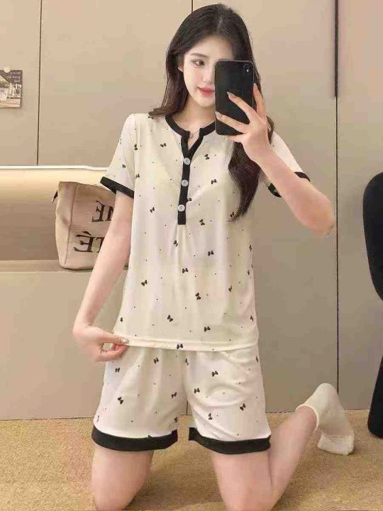 ☕️整款冰丝短袖短裤家居服睡衣套装104套全清9.8元,黑白色,M到XXL码数,独立包装高弹力,[庆祝][庆祝][庆祝]冰丝睡衣女夏季短袖短裤高级感韩系波点蝴蝶结夏天家居服套装