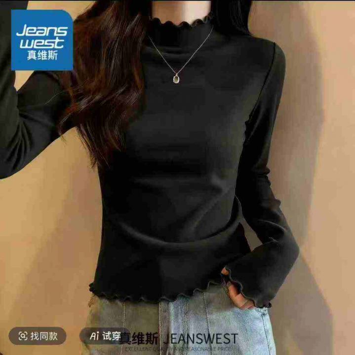 木耳边半高领打底衫女秋冬新款加绒保暖内搭外穿上衣,...