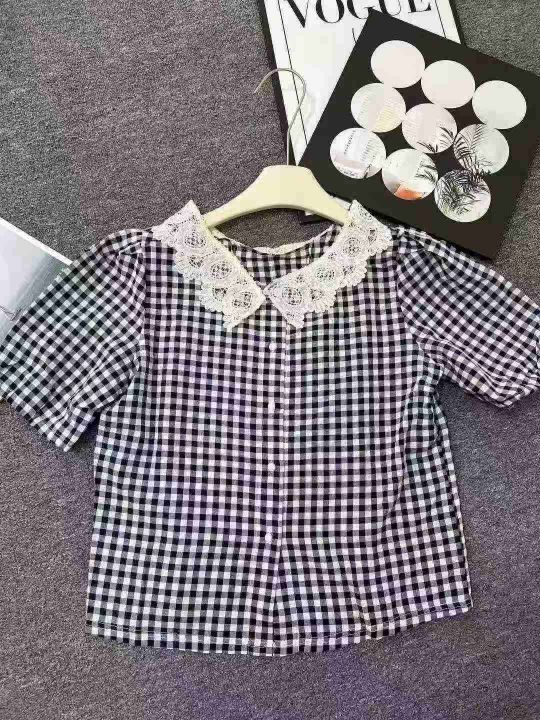 ☕️娃娃领短袖衬衫女夏季花边蕾丝格子衬衣宽松显瘦法...