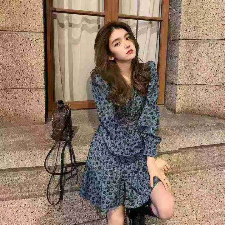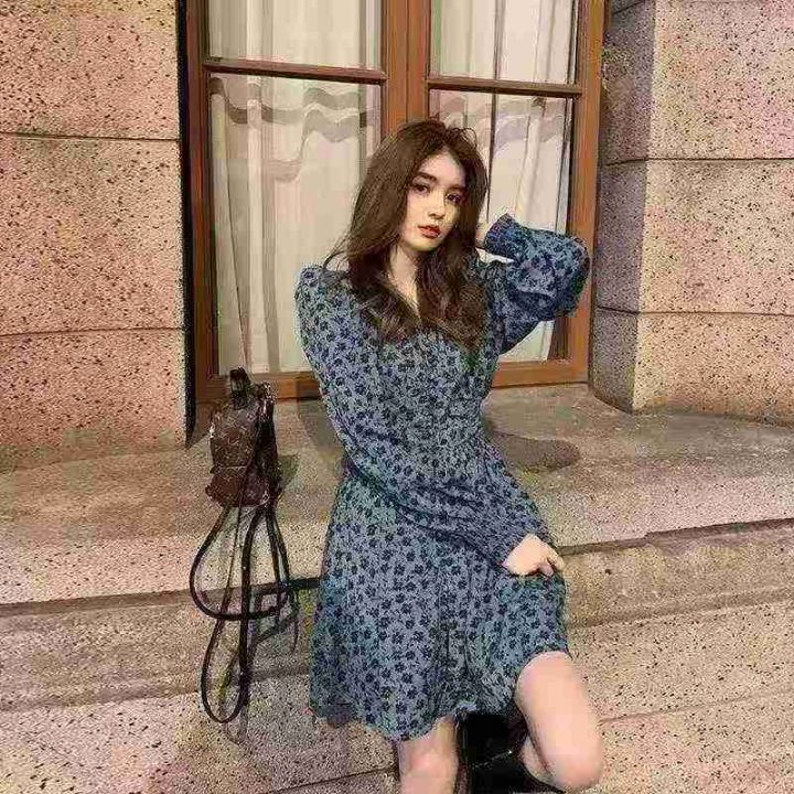 [转圈][转圈]靓妹法式收腰显瘦蓝色碎花v领,长袖连衣裙女春秋复古裙子,独立包装51件均码,全清11.8[转圈][转圈]