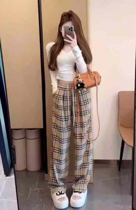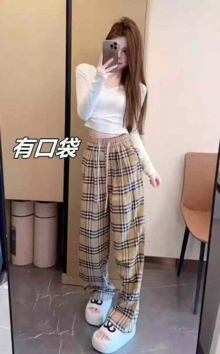 [转圈][转圈]高腰抽绳宽松阔腿卡其格子裤,垂感柔软舒...