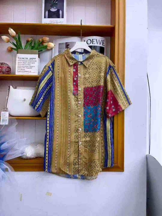 ① 夏季新款美式复古男女同款拼色设计短袖衬衣!版型...
