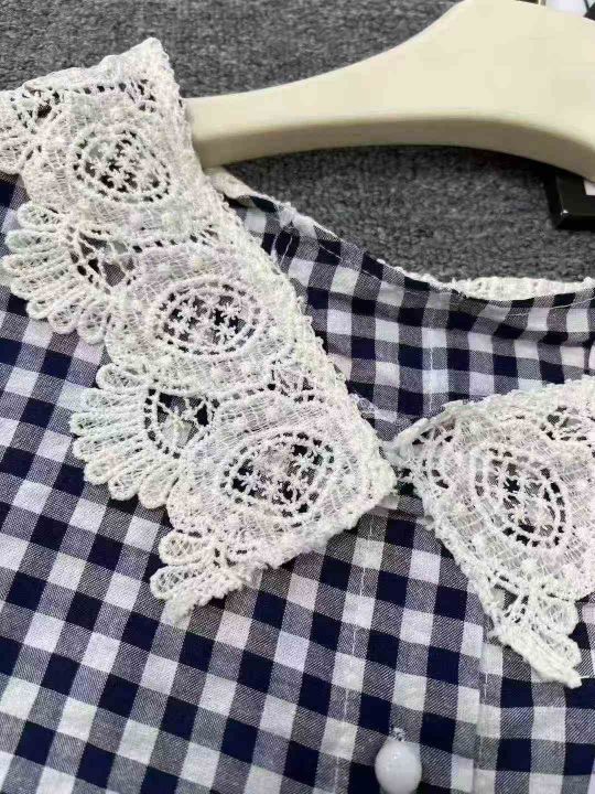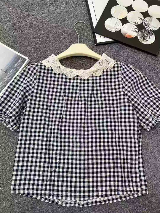 ☕️娃娃领短袖衬衫女夏季花边蕾丝格子衬衣宽松显瘦法...