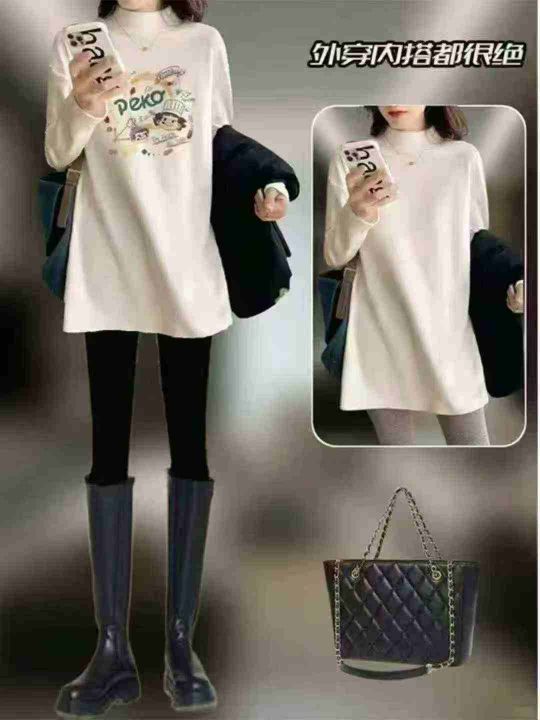 圆领/半高领德绒打底衫女新款内搭宽松白色印花中长款...