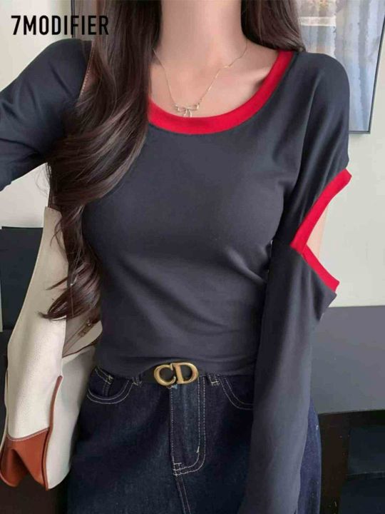 春秋网红新款撞色拼接漏肩韩系长袖T桖,独立包装,码...