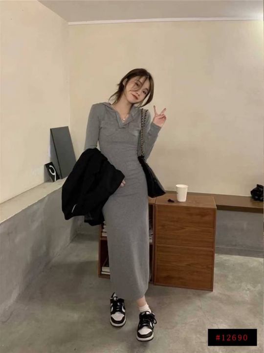 [月亮]:辣妹修身包臀开衩连帽卫衣长裙连衣裙