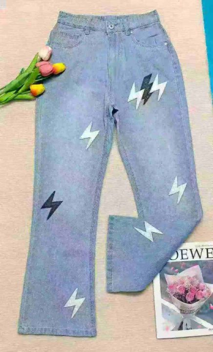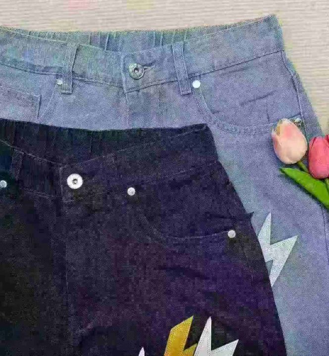 水洗棉直简微喇叭长裤松紧腰美式潮牌宽松闪电皮刺绣牛仔裤,488件,S-2XL,男女同款,独立包装,全清13.8元,分货+0.5