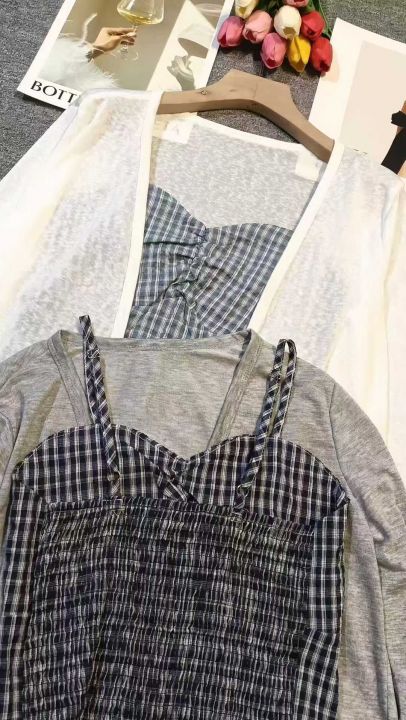 韩系不规则设计感格子吊带➕防晒开衫套装,[爱心]135套左右,灰色为主,码数S-L,穿80-130斤,万佳档口货,原包装️无瑕疵,[666]实体店品质,分货加一