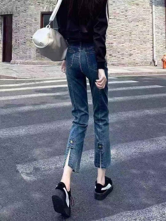 直筒牛仔裤女春秋时尚新款小个子高腰显瘦开叉烟管裤子...
