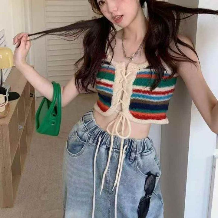夏季新款辣妹性感纯欲风设计感抽绳绑带彩虹条纹针织吊...