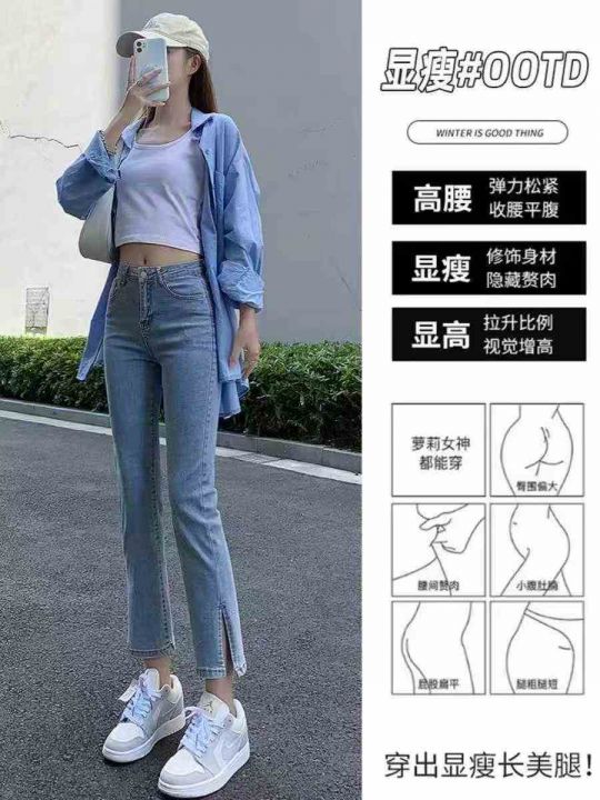 九分牛仔裤女新款高腰显瘦弹力开叉浅色小个子直筒烟管...