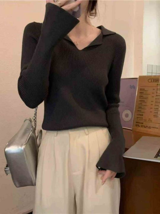 春秋新款法式复古净版简约宽松Polo领坑条包芯纱套头毛衣,独立包装,均码面...