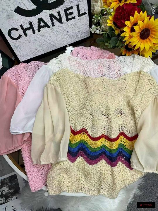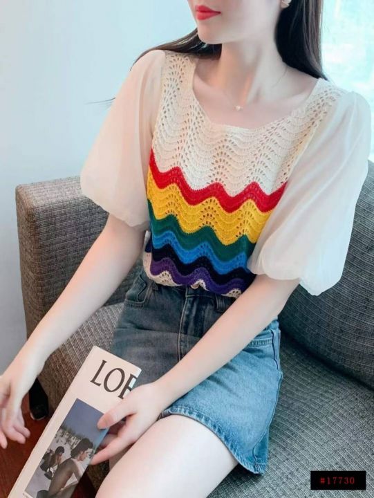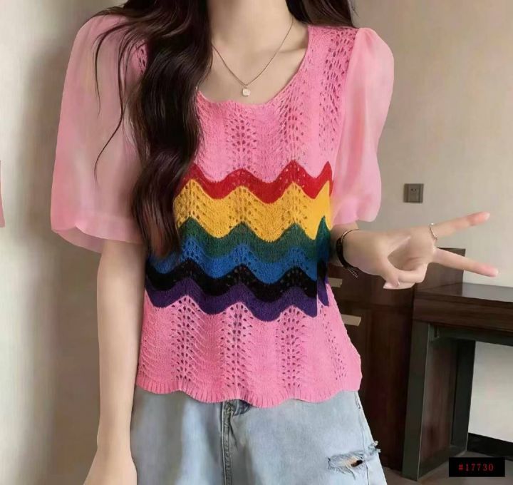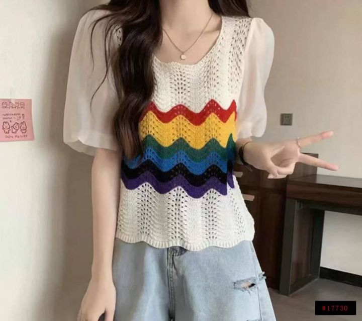 夏季新款镂空撞色彩虹雪纺拼接泡泡袖冰丝的短袖针织衫,独立包装,均码面料柔软舒适,539件,全清6.9元超低价秒杀!分货加一!@_@