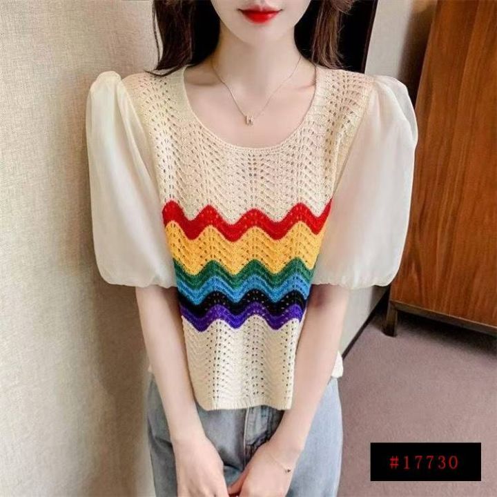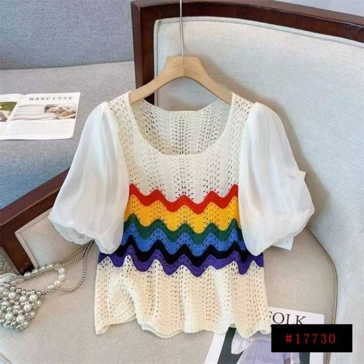 夏季新款镂空撞色彩虹雪纺拼接泡泡袖冰丝的短袖针织衫...