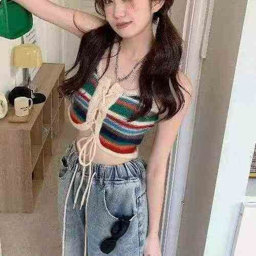 夏季新款辣妹性感纯欲风设计感抽绳绑带彩虹条纹针织吊...