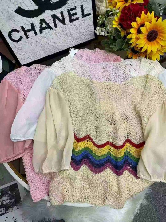 夏季新款镂空撞色彩虹雪纺拼接泡泡袖冰丝的短袖针织衫,独立包装,均码面料柔软舒适,539件,全清6.9元超低价秒杀!分货加一!