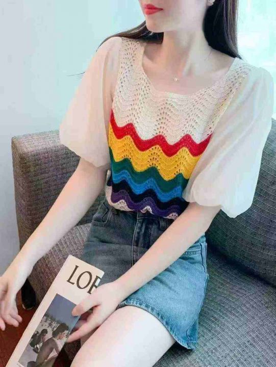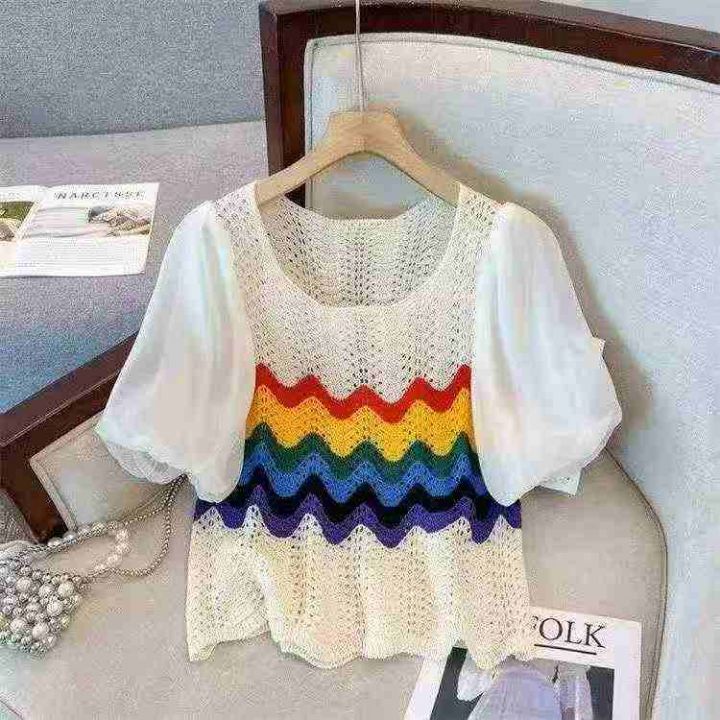 夏季新款镂空撞色彩虹雪纺拼接泡泡袖冰丝的短袖针织衫...