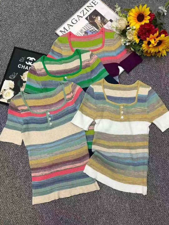 夏季新款弹力修身显瘦撞色彩虹条纹针织短袖T桖,独立包装,均码面料软糯舒适弹力大,740件,全清5.9元超低价秒杀!分货加一!