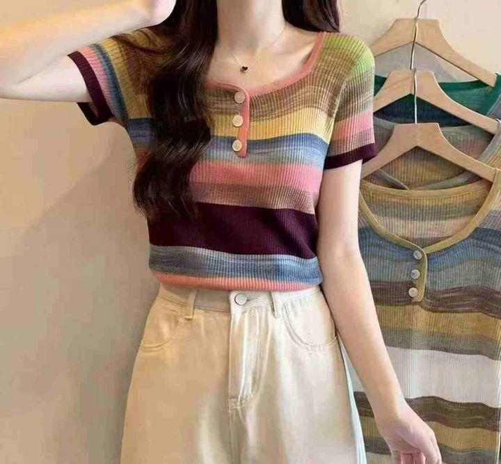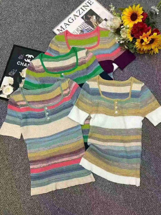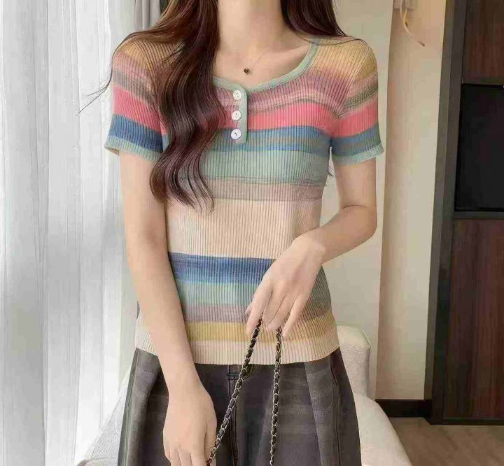 夏季新款弹力修身显瘦撞色彩虹条纹针织短袖T桖,独立包装,均码面料软糯舒适弹力大,740件,全清5.9元超低价秒杀!分货加一!