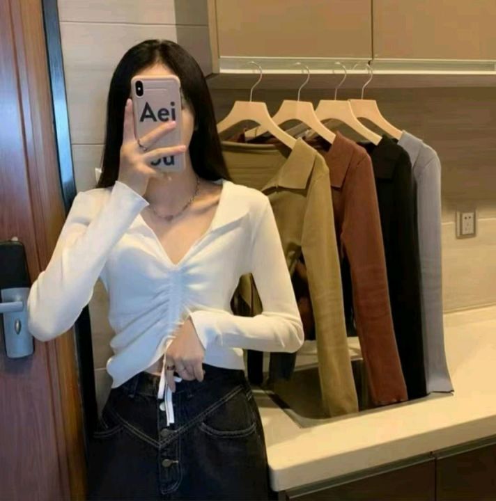 秋季新款韩版复古网红抽绳绑带设计款Polo领长袖针织套头毛衣,独立包装,均...