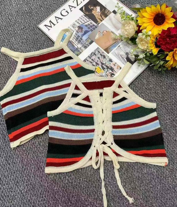 夏季新款辣妹性感纯欲风设计感抽绳绑带彩虹条纹针织吊...