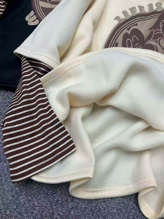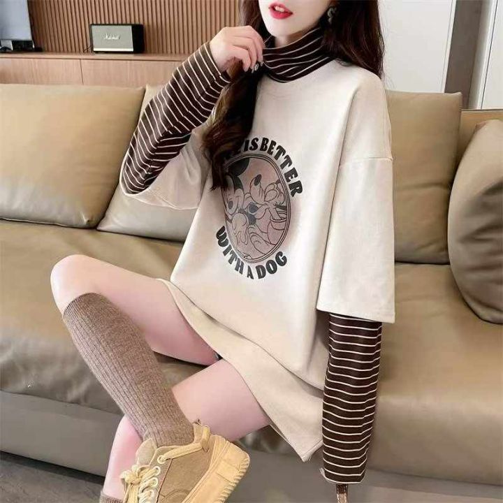 冬季新款加绒大码假两件长袖拼接慵懒风韩版宽松百搭加...