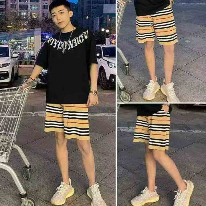 夏季新款男女同款网红款抽绳直筒宽松条纹冰丝针织短裤...