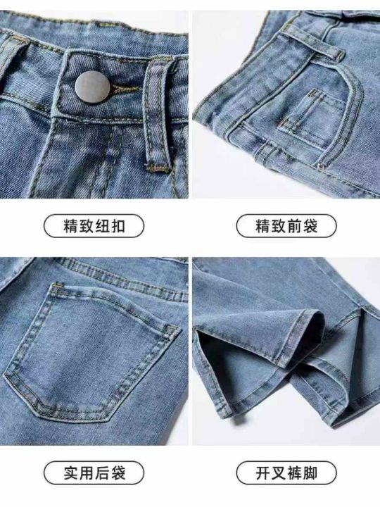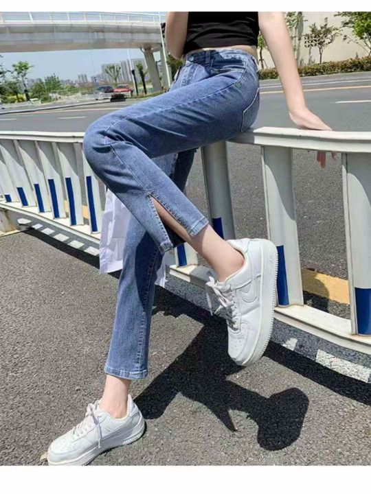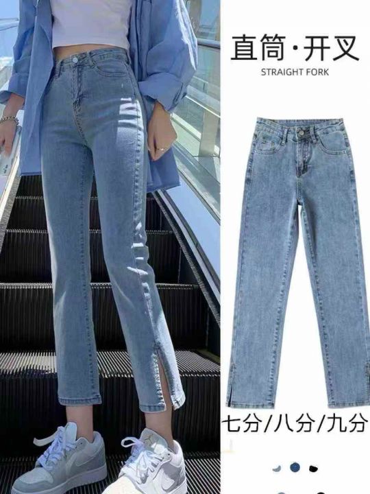 九分牛仔裤女新款高腰显瘦弹力开叉浅色小个子直筒烟管...