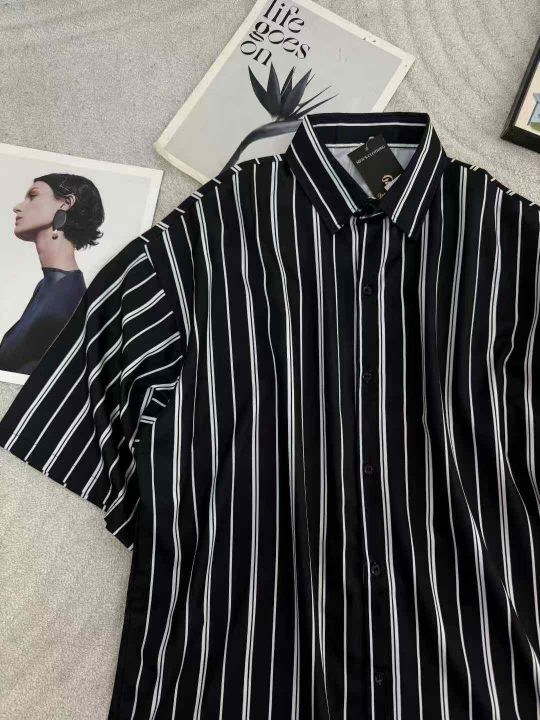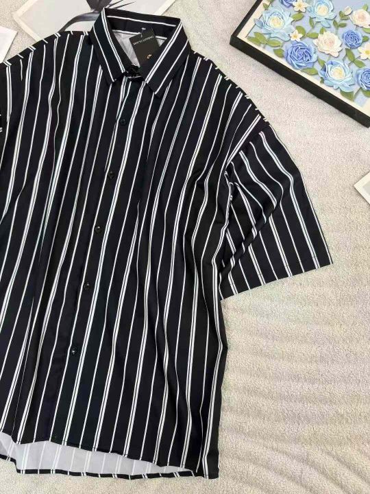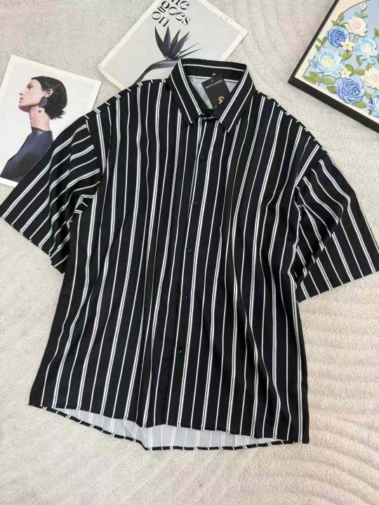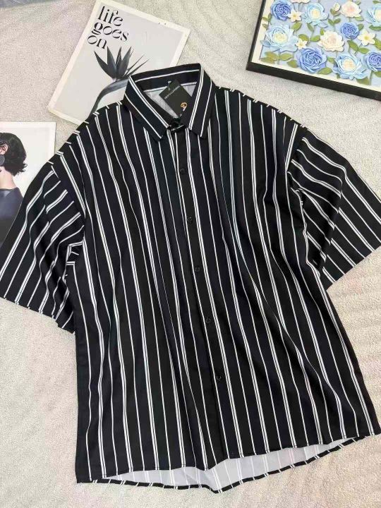高级感条纹衬衫短袖男春夏季薄款复古港风黑衬衣宽松五分袖开衫