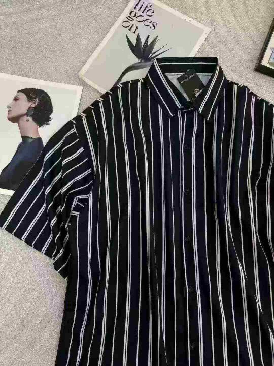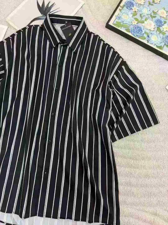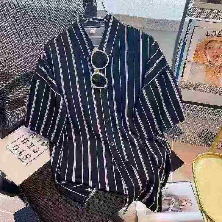高级感条纹衬衫短袖男春夏季薄款复古港风黑衬衣宽松五分袖开衫