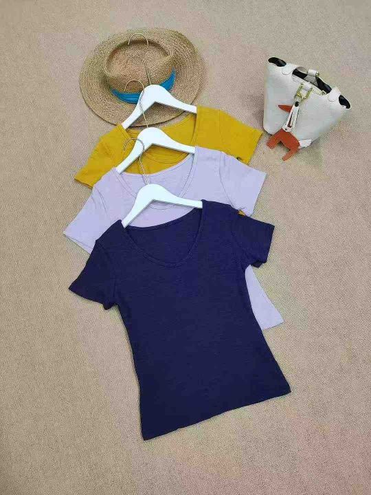 [月亮]:韩系褶皱肌理感V领正肩T恤