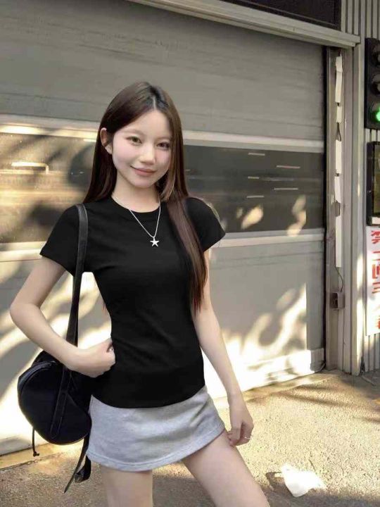 ☕️纯棉韩系正肩圆领纯色短袖T恤女夏季收腰修身设计...