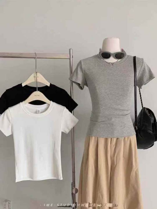 ☕️纯棉韩系正肩圆领纯色短袖T恤女夏季收腰修身设计感短款上衣500件全清7....