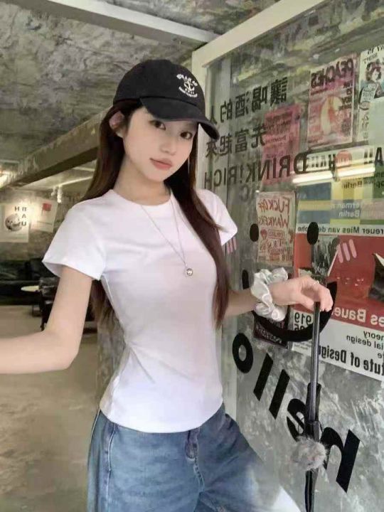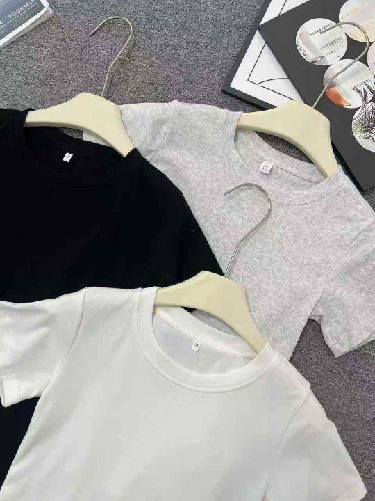 ☕️纯棉韩系正肩圆领纯色短袖T恤女夏季收腰修身设计...