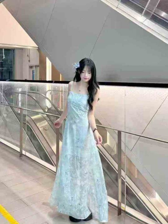 法式绝美蓝色碎花吊带连衣裙女夏季后背绑带收腰气质长裙礼服 独立包装 码数...