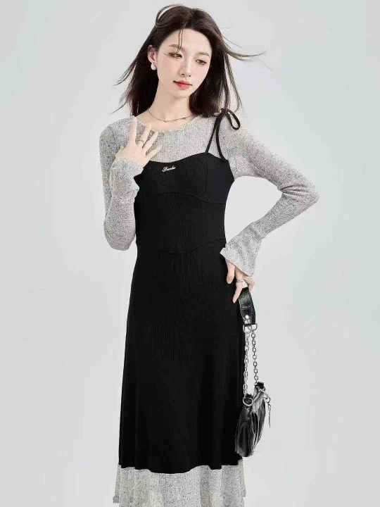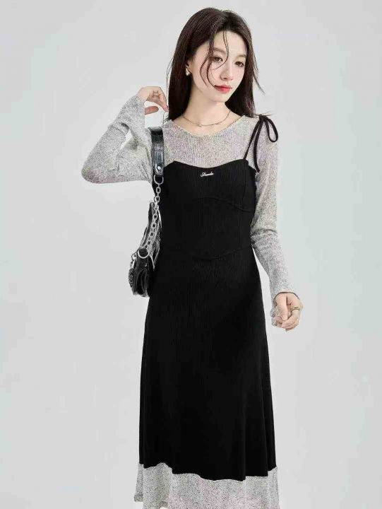 法式气质黑色连衣裙女秋冬季新款韩系假两件针织拼接长...